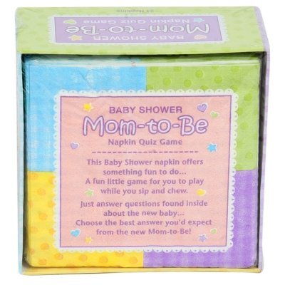24 multi-colored paper napkins that measure approximately 5" wide x 5" high. The inside of the napkin has a series of 12 multiple choice questions to answer about the baby. Get the most answers right and you win!
